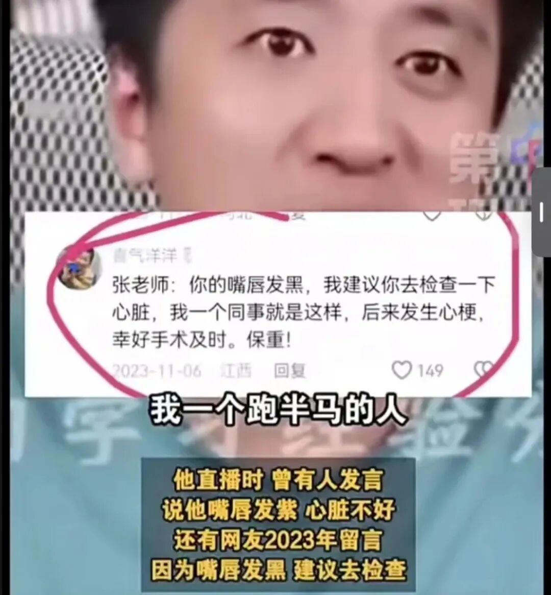 张雪峰2023年曾因胸闷心悸住院,嘴唇发黑也被网友指出,这强烈提示其心脏可能长期处于代偿性工作状态,存在心肌缺血或电生理不稳定。
