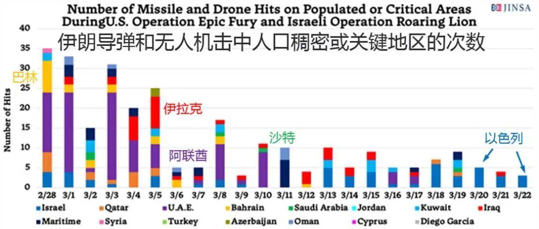 伊朗不得不把一大半近程火力——特别是无人机——转向阿联酋、沙特、科威特等海湾国家,重点打击美军基地与能源基础设施,企图通过扰乱全球能源供应、推高油价向美方施压。