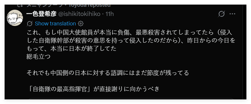 最后,有日本网民注意到,在高市此次饱受“谄媚”恶评的访美后,日本的网络上居然出现了一批美化日本当年在亚洲和太平洋发动的战争的视频,而且这些视频还获得了不少点赞和支持。该网民认为,这样的视频,或许也在一定程度上刺激了此次冲闯中国大使馆的村田晃大,而且可能会影响更多的人走向极端。