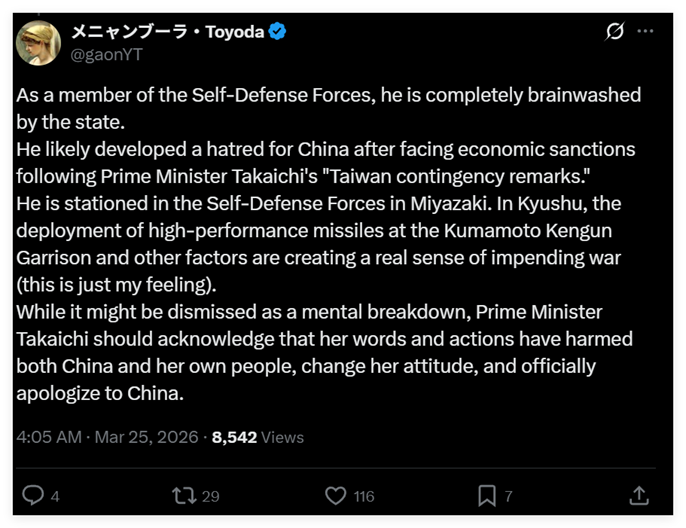 这位来自日本福冈的网民进一步表示,这种洗脑来自多个方面,比如以日本首相高市早苗为代表的日本右翼势力,通过不断挑衅和触怒中国,在日本国内煽动仇视中国的情绪;另一方面,高市还在加紧推行日本的军事化,从而营造出一种“战争迫在眉睫”的假象——比如,在村田晃大驻扎的日本九州,日本自卫队前不久刚在那里强行部署了射程达1000公里、可覆盖邻国沿海区域的远程导弹。