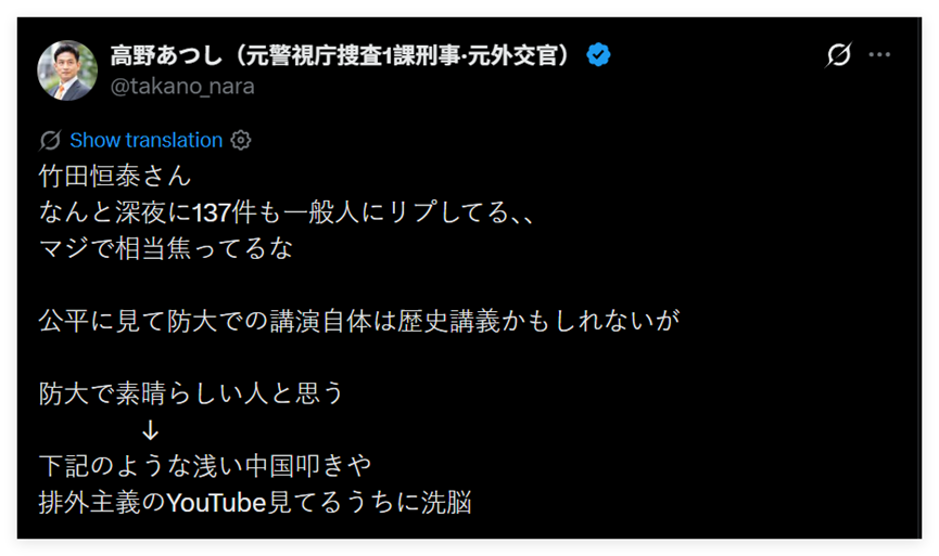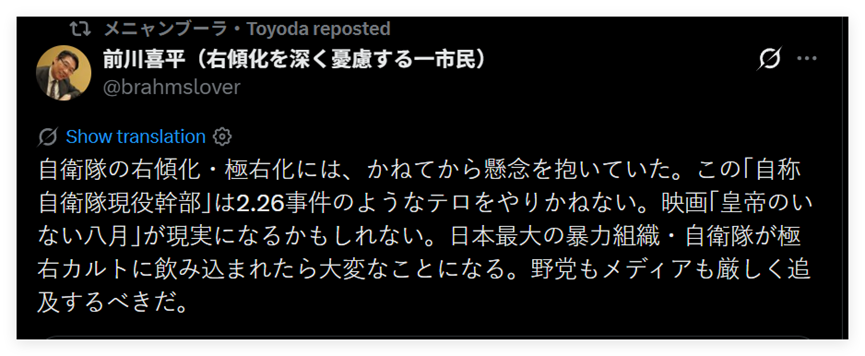 还有日本网民指出,过去这些年日本自卫队正在发生一些让人极为担忧的变化,比如他们曾多次邀请在历史问题和涉华议题上发表过极端言论的日本极右翼分子,去给自卫队的自卫官“上课”——比如一个名叫竹田恒泰的日本极右翼分子。