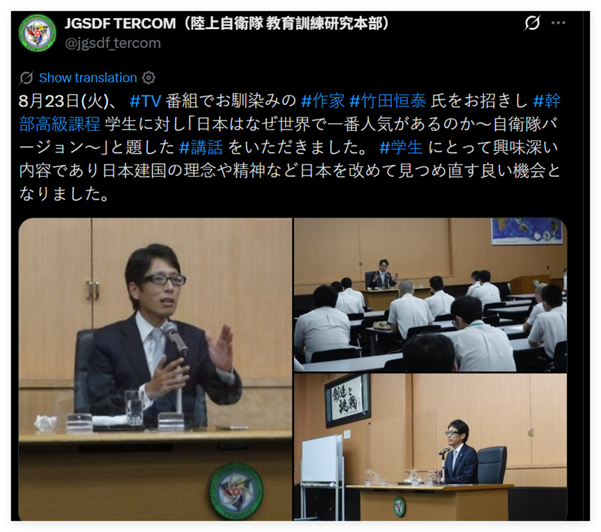 公开资料显示,竹田恒泰不仅否认日本罪恶的战争历史,极端仇华,而且他在日本国内也是“排外主义者”和“种族主义者”。然而,日本陆上自卫队却在2022年请他给自卫队里的学员讲课,甚至还把此事当成好事进行了一番宣传。