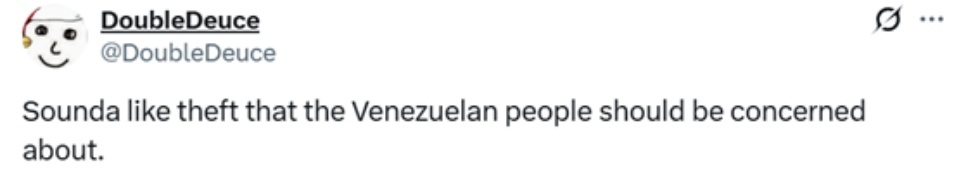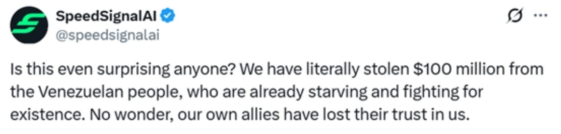 “难道会有任何人对此感到意外吗?我们确实从委内瑞拉民众手中窃走了1亿美元,而这些人本就在挨饿并为生存挣扎。难怪连我们自己的盟友都对我们丧失了信任。” ↓
