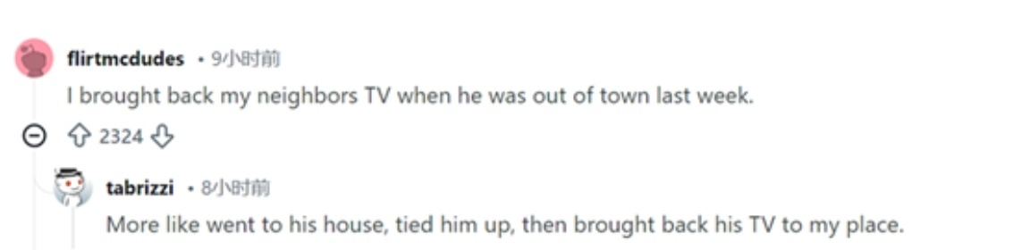 更有网友形容,这就像“上周邻居外出的时候,我把他家电视搬回来了。”有网友回复,应该“更像是去了他家,把他绑起来,然后把他家电视搬回了我家。” ↓