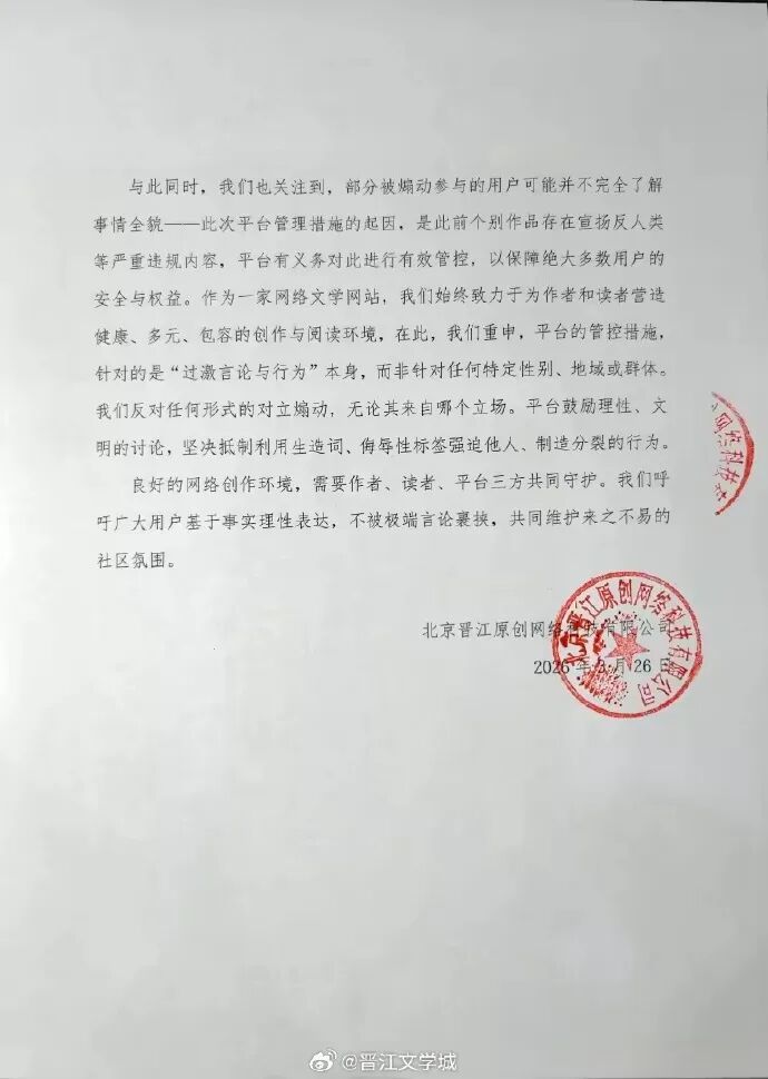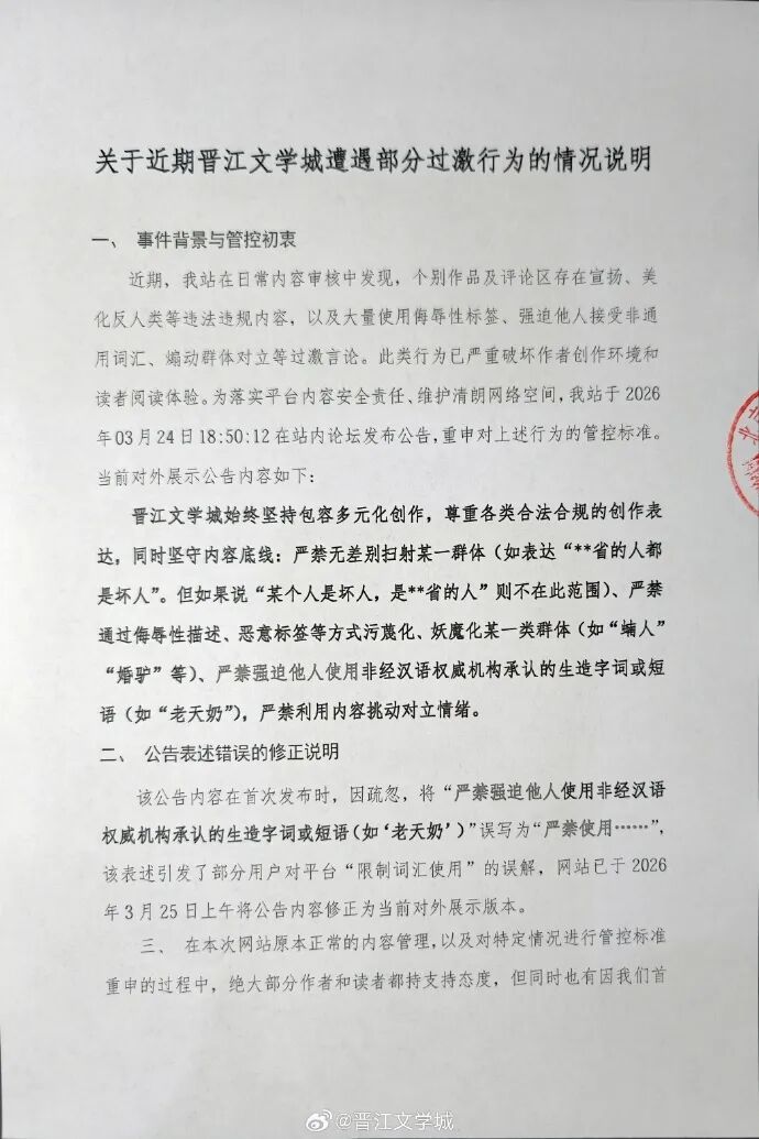3月26日下午,晋江文学城发布《关于近期晋江文学城遭遇部分过激行为的情况说明》回应近期热议事件:近期,我站在日常内容审核中发现,个别作品及评论区存在宣扬、美化反人类等违法违规内容,以及大量使用侮辱性标签、强迫他人接受非通用词汇、煽动群体对立等过激言论。此类行为已严重破坏作者创作环境和读者阅读体验。为落实平台内容安全责任,维护清朗网络空间,我站于2026年03月24日18:50:12在站内论坛发布公告,重申对上述行为的管控标准。