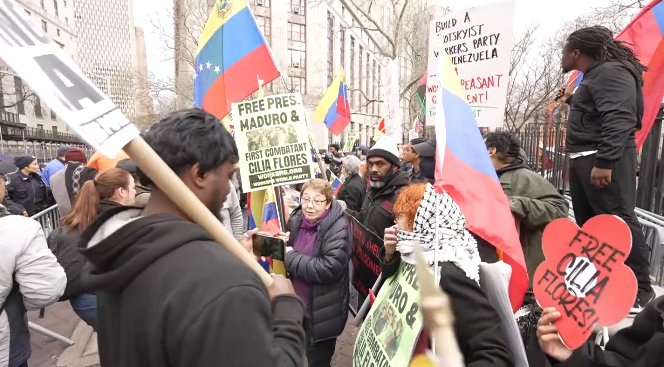当天上午,一些马杜罗的支持者聚集在法院外,高呼口号,要求释放马杜罗,反对美国政府军事干涉委内瑞拉。