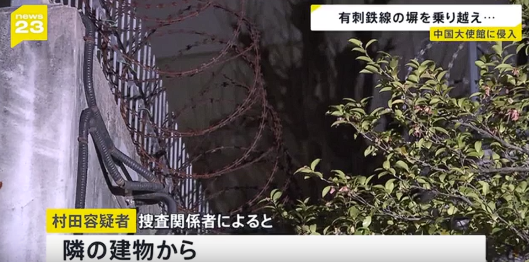 ·大使馆院墙上的有刺铁丝网。(东京广播公司新闻画面截图)