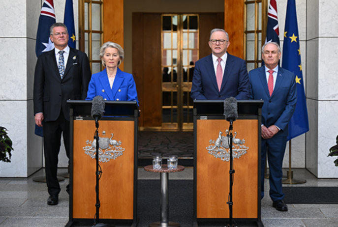当地时间3月24日,欧盟委员会主席冯德莱恩与澳大利亚总理阿尔巴尼斯在堪培拉签署全面自由贸易协定。