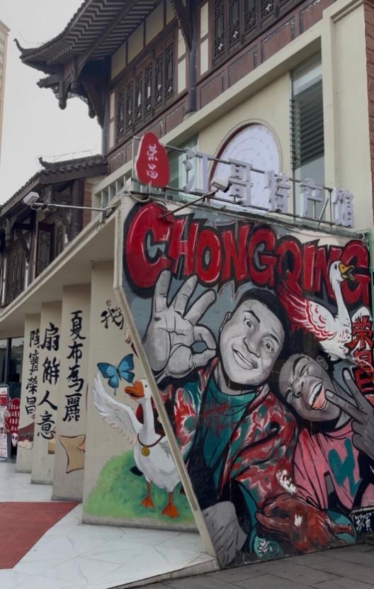 在江哥特产馆的外墙上,“卤鹅哥”和“甲亢哥”的彩绘在阳光下很显眼。画里的人还在笑着,画外的人已经收拾好行李。在接受完采访后,林江踏上了去成都的高铁,他要赶往下一个活动。