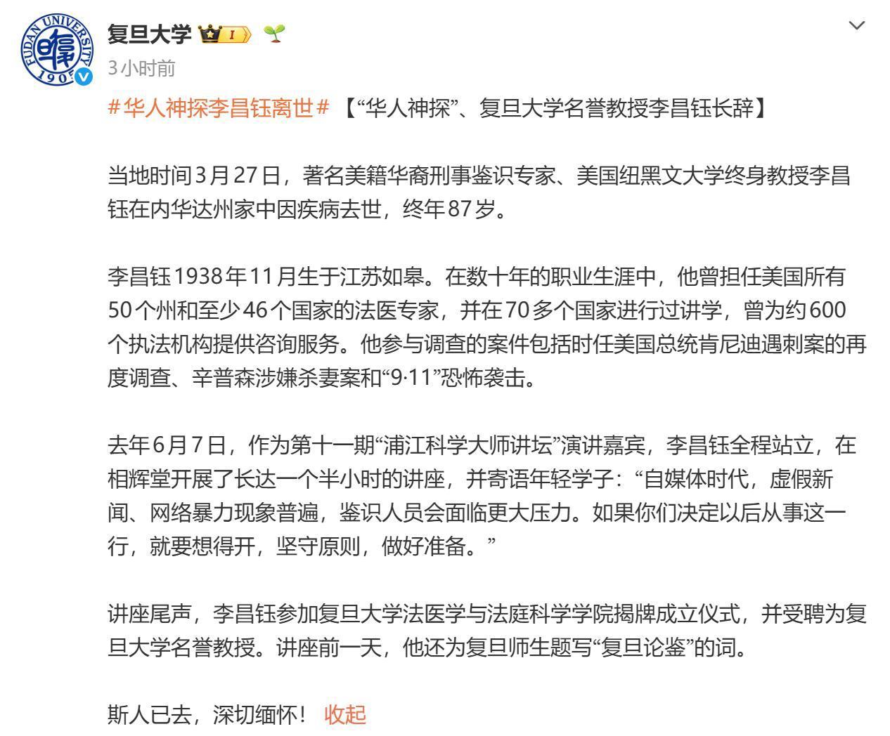 复旦大学官方微博写道:去年6月7日,作为第十一期“浦江科学大师讲坛”演讲嘉宾,李昌钰全程站立,在相辉堂开展了长达一个半小时的讲座,并寄语年轻学子:“自媒体时代,虚假新闻、网络暴力现象普遍,鉴识人员会面临更大压力。如果你们决定以后从事这一行,就要想得开,坚守原则,做好准备。”