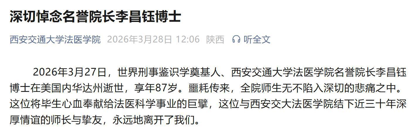 西安交通大学法医学院发文:自1996年起,李昌钰便与原西安医科大学结缘,受聘担任法医学院名誉院长。2000年西安医科大学与西安交通大学合并后,他欣然续任,成为新西安交通大学法医学院的名誉院长,2008年又受聘为学校名誉教授,并获法医学博士生导师资格。从那一刻起,他便将西安交大视作自己的精神家园,将推动中国西部法医学科发展作为自己的使命担当。