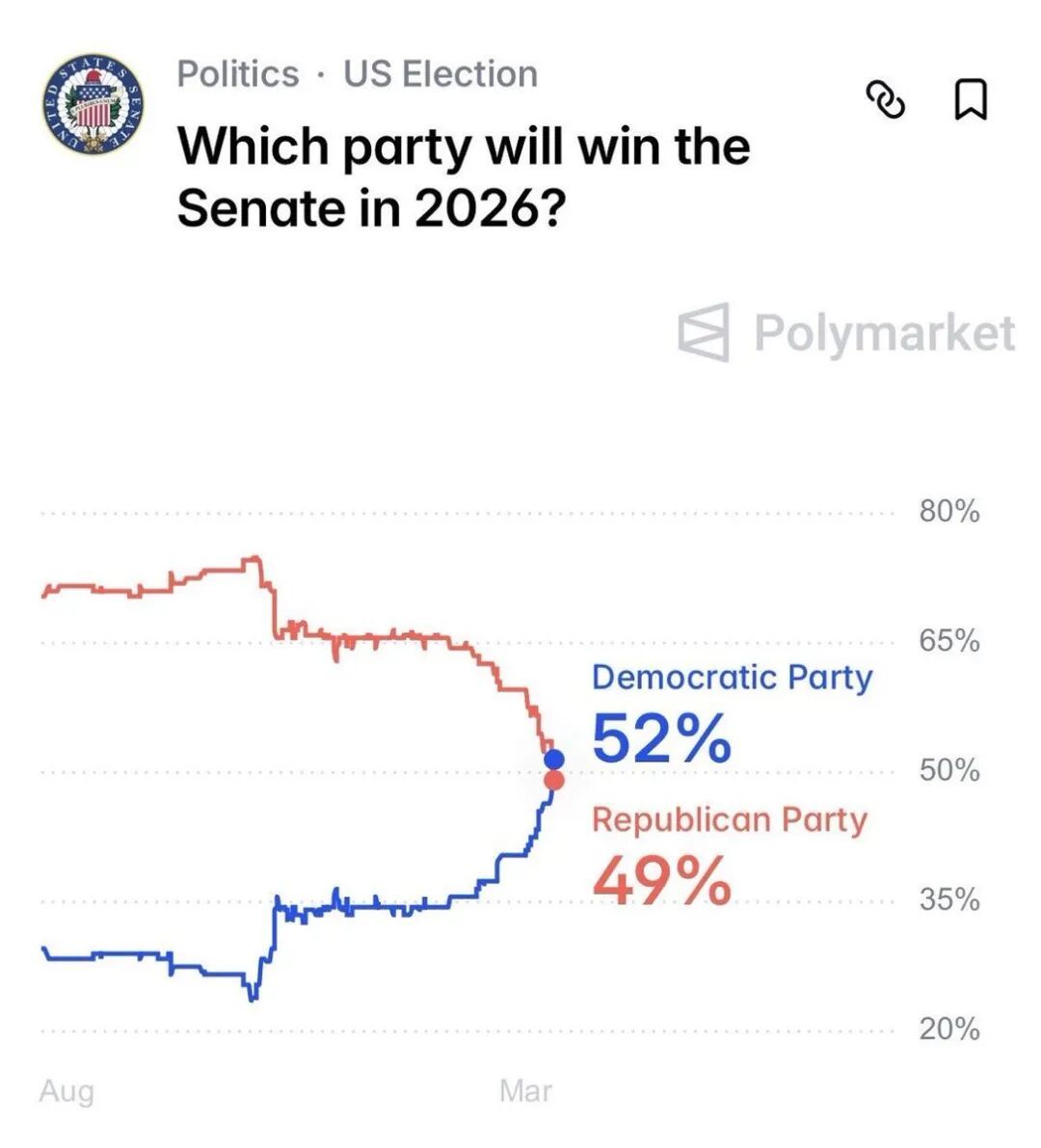 这一结构很快将在中期选举中接受检验。决定结果的,不是MAGA基本盘,而是摇摆选民。在众议院席位优势本就极为有限的背景下,Polymarket最新预测显示,参议院亦有望翻盘。