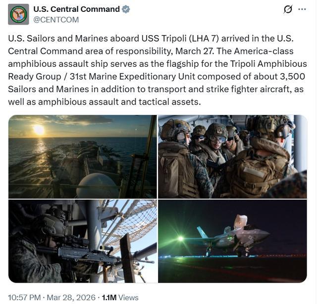 美军中央司令部28日在社交媒体上宣布,载有 3500 名水兵和海军陆战队员的“的黎波里”号两栖攻击舰已抵达美军中央司令部责任区。