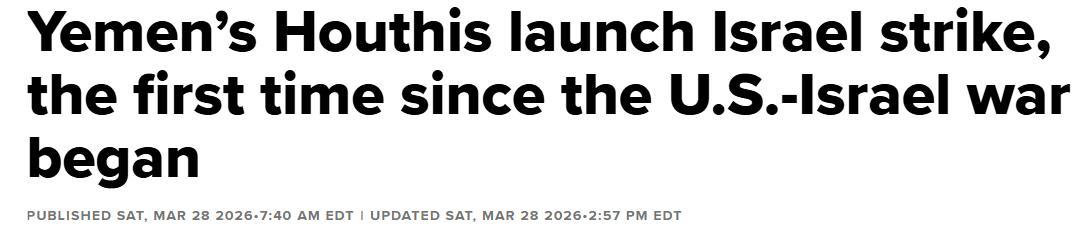 当地时间周六(3月28日),胡塞武装发言人叶海亚·萨雷宣布首次袭击行动称,他们已发射了“一系列弹道导弹,目标是以色列南部的敏感军事设施” 。这是自一个月前美以伊战事爆发以来,他们首次采取此类行动。