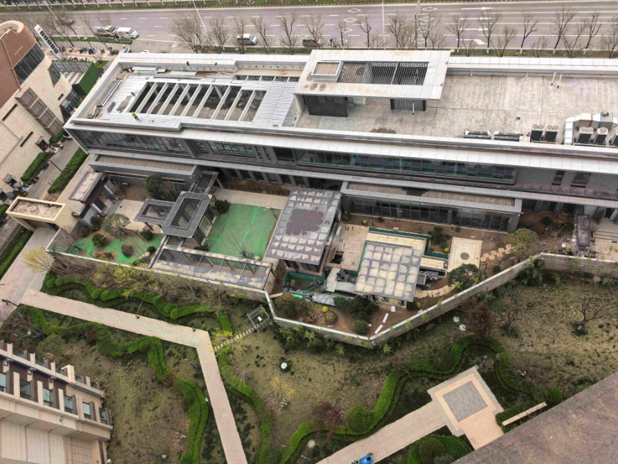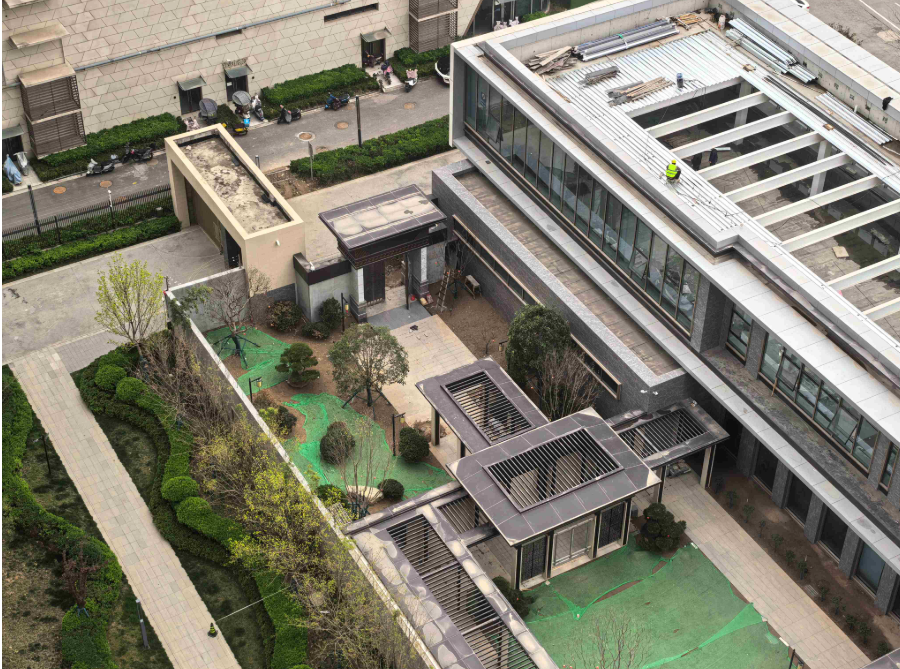 记者从附近高楼俯视,看到了31号建筑和围墙之间、已经基本建成的封闭四进花园全貌:从东边门楼进入后是第一进花园,里面中间道路做了硬化,南北两边土地上栽植有树木;第二进花园内四周做了硬化,中间是土地,用绿网覆盖着,地面高度明显要比第一进花园高;在第一进和第二进之间有游廊相连接。第三进花园内有水景、亭榭、小桥、花园、假山、石径等,有一处“地下室”一样的构筑,盖板掀开着,里面摆着一架梯子,连接着院落地面。在这进花园内靠近住宅小区围墙的区域被堆土填平后,栽植了树木、绿植,其高度明显比一墙之隔的小区内的绿地要高很多。可能也正是因堆土太厚,所以才需要加高小区围墙,否则从小院内看小区就没有了围墙边界。第四进院子向西到尽头后朝南拐向31号建筑的西边,并转而和这座建筑前面的区域相连。