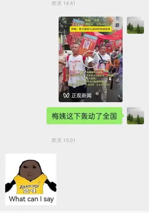 3 月 21 日中午,在湖南道县养猪的父亲李树全,发来 “梅姨落网” 的第一条新闻。半小时后,刚打完游戏的林蔚,回了一个“围观鼓掌”的表情包。