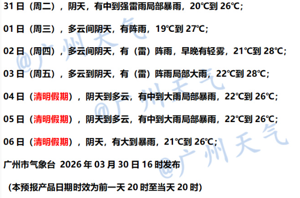 广州市气象台预计,3月31日,受高空槽、南风加强和切变线的影响,广州仍有中到强雷雨局部暴雨,并伴有短时大风(9~11级)、短时强降水(最大小时雨强20~40毫米)和局地冰雹等强对流天气。4月1日—2日降水减弱。