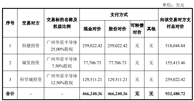 根据披露的发行股份及支付现金购买资产并募集配套资金报告书(草案),TCL科技拟通过发行股份及支付现金的方式购买恒健投资、城发投资、 科学城投资持有的广州华星半导体45.00%股权(对应注册资本787,500.00万元)并募集配套资金,交易价格93.25亿元。其中发行股份对价金额为46.62亿元,现金支付对价金额为46.62亿元。