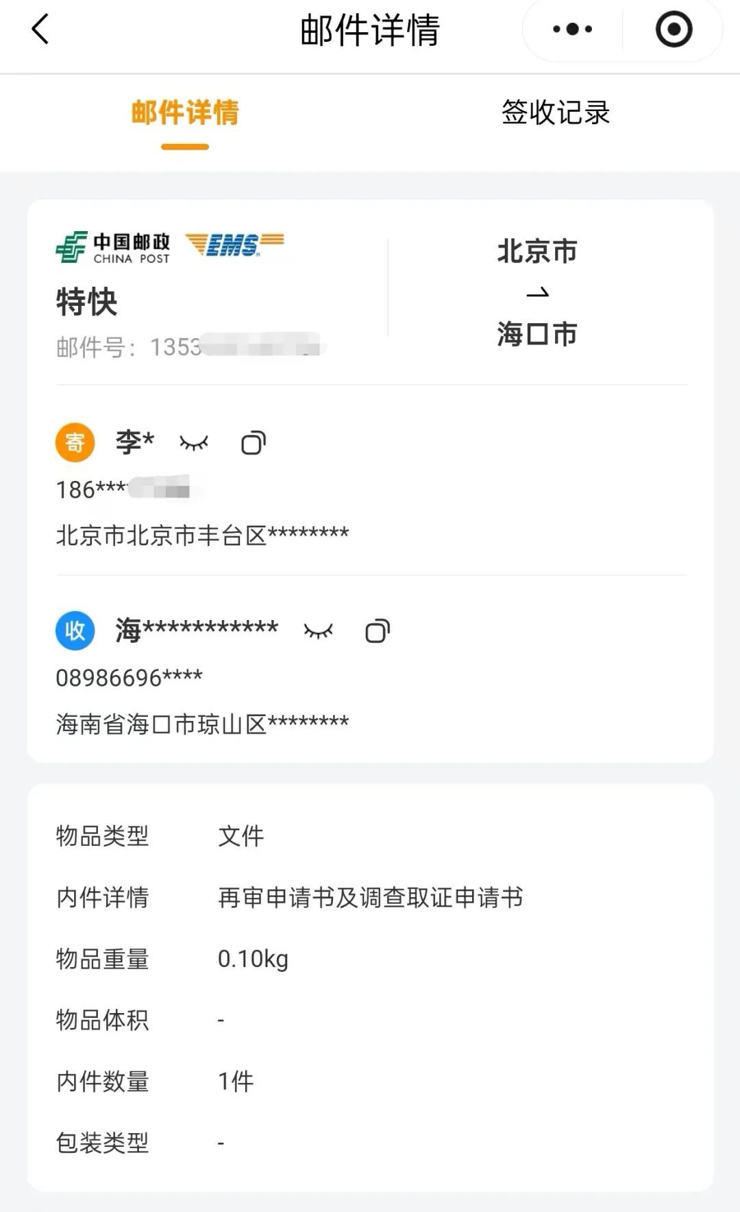 李果给海南高院寄去的再审申请凭证。