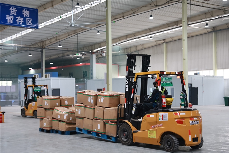 3月30日,郑州机场中大门前置货站内,一批跨境电商货物顺利完成海关申报、查验、安检等全流程作业,经专用驳运车辆运抵机场装机发往欧洲。本报全媒体记者 聂冬晗 摄