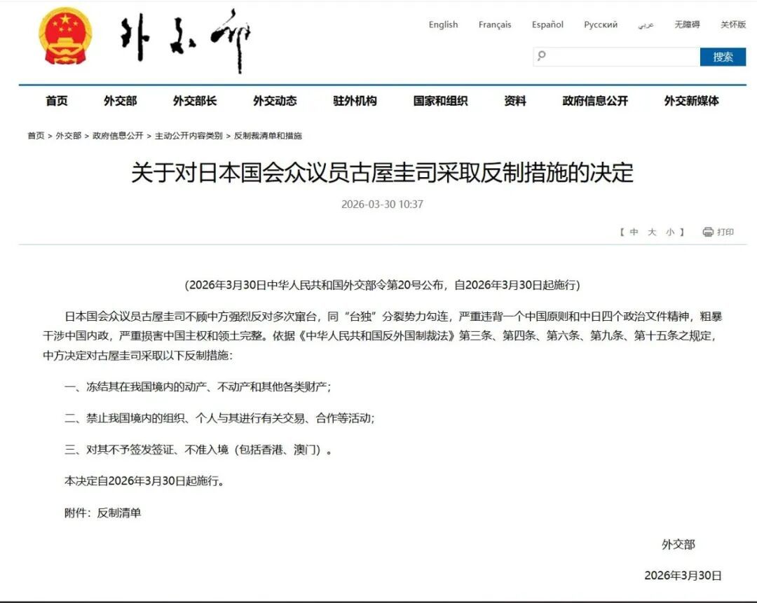对此,3月30日,中国外交部发布对古屋圭司的系列反制措施。这是中方继2025年9月制裁参议员石平、12月制裁前统合幕僚长岩崎茂后,第三次对日本右翼政客出手。