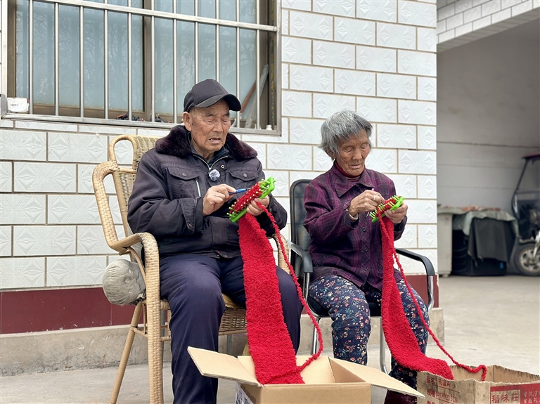 3月29日,春日暖阳洒在安阳市龙安区龙泉镇西洪沟村的一个农家小院里,91岁的赵中福和老伴张娥梅像往常一样,坐在板凳上织围巾,指尖翻飞间,一条红围巾渐渐成形。