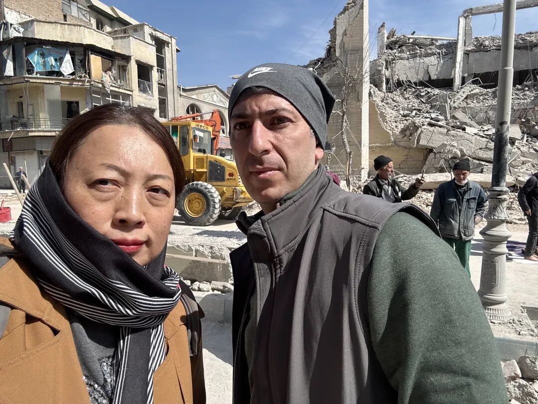 △2026年3月3日,伊朗德黑兰,革命广场对面的警察局大楼被炸,凤凰卫视记者李睿和摄影师伊朗人穆森在现场采访。