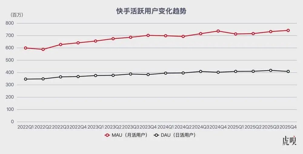 更糟的是季度数据的环比下滑:2025 年四个季度,快手日活分别为 4.08 亿、4.09 亿、4.16 亿、4.08 亿,受暑期流量红利消退等多重因素叠加,四季度较三季度环比流失 800 万用户;月活同比增速更骤降至 0.7%,创下 2021 年上市以来历史最低值。