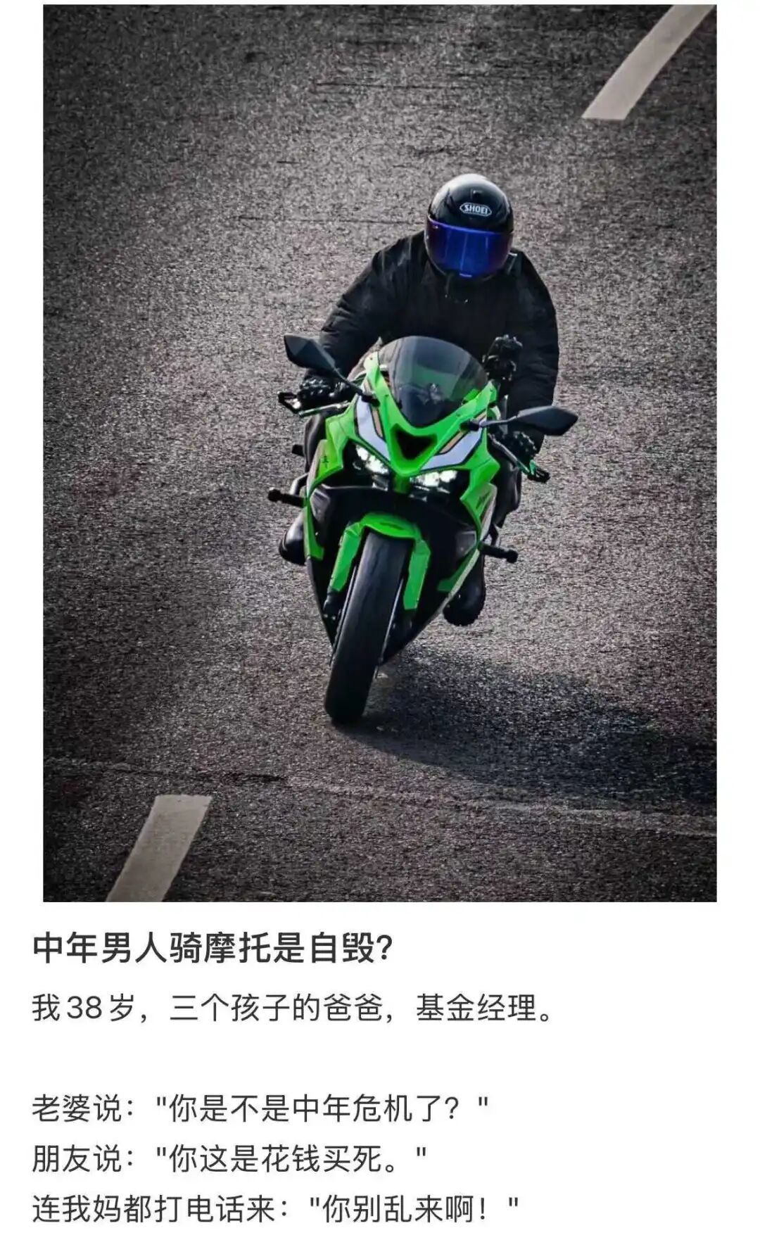 有网友自嘲,“中年男人骑摩托,堪称自毁。