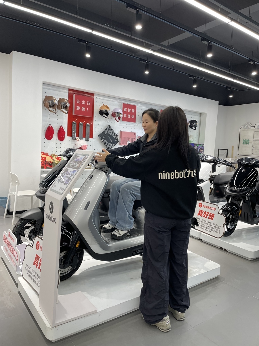 一家九号的门店内,顾客正在体验电动自行车