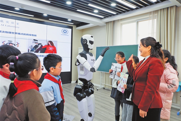 近日,河南省科学院“行者二号”机器人走进焦作市山阳区塔南路小学,与小朋友互动,灵活完成挥手、行走等动作,把科技知识变成可触摸、可感受的生动课堂。 宋崇飞 摄