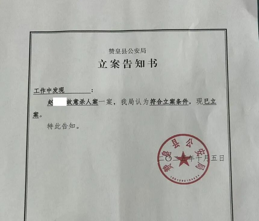 受害者家属提供的立案告知书