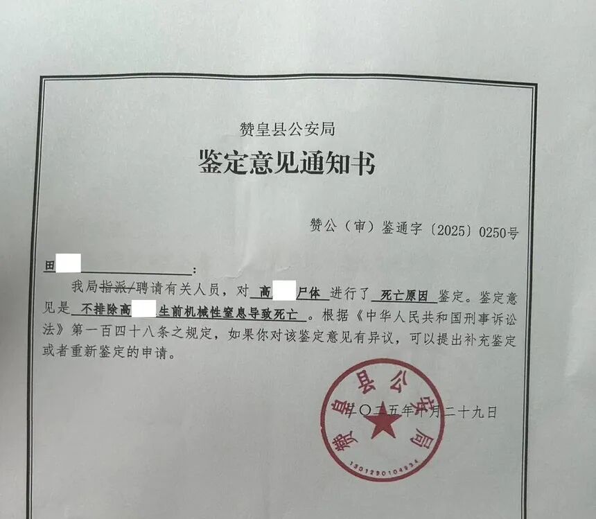 小田称,赵某某实施第一次勒颈后,发现母亲有生还的迹象,遂第二次动手,直到母亲彻底死亡。据家属提供的鉴定意见通知书:不排除高某某系生前因机械性窒息导致死亡。“发现我母亲时,已过半月,面目全非,不看衣服根本认不出。”小田哽咽着说道。
