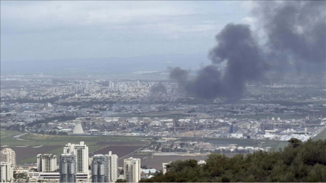 3月30日,以色列海法,伊朗和真主党同时对一处炼油厂发动报复性袭击,现场冒出浓烟。(图源:阿纳多卢通讯社)
