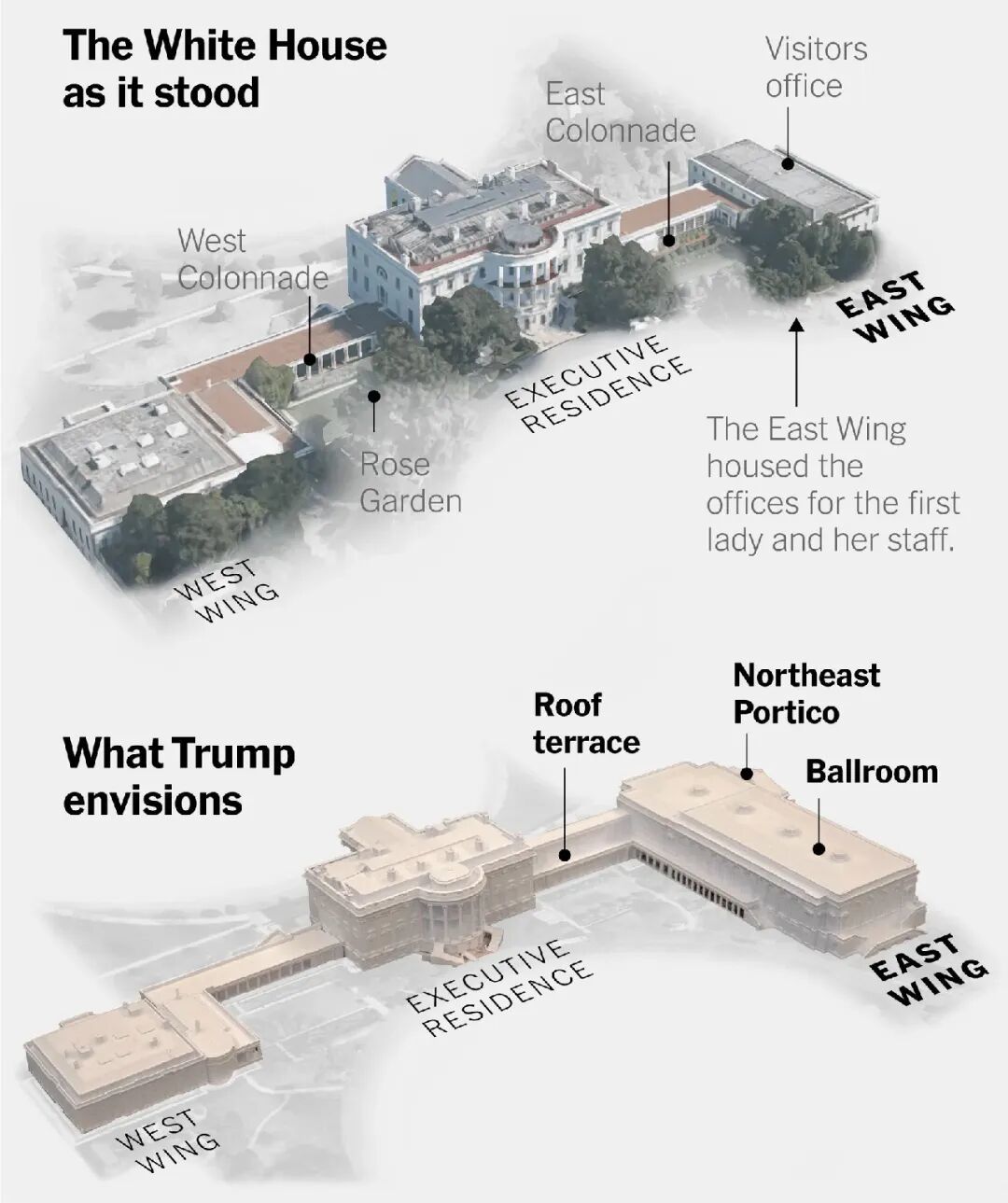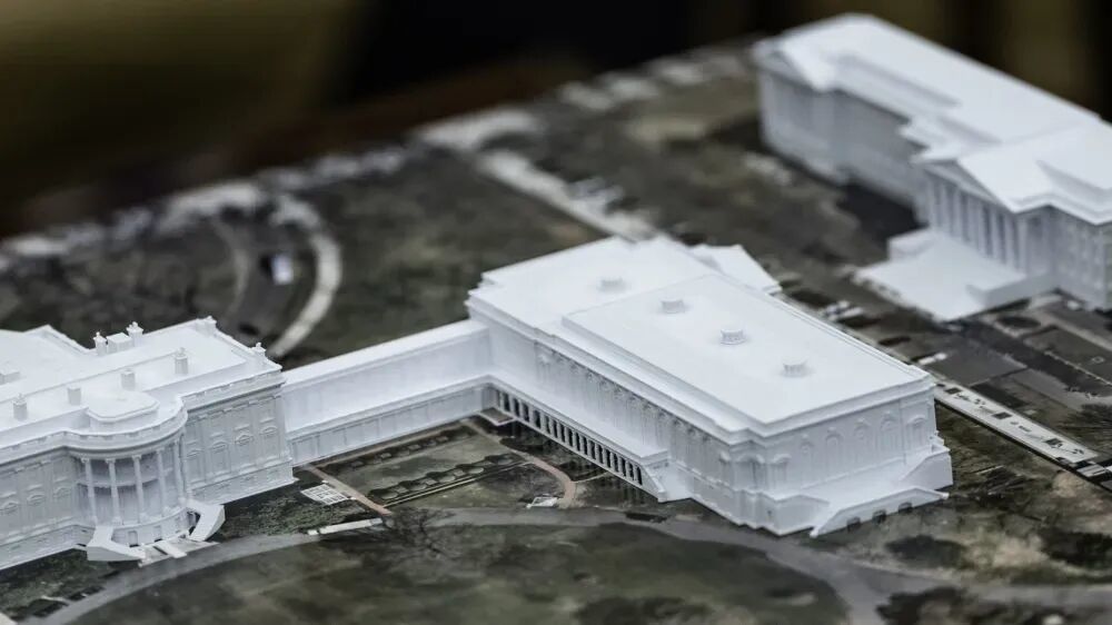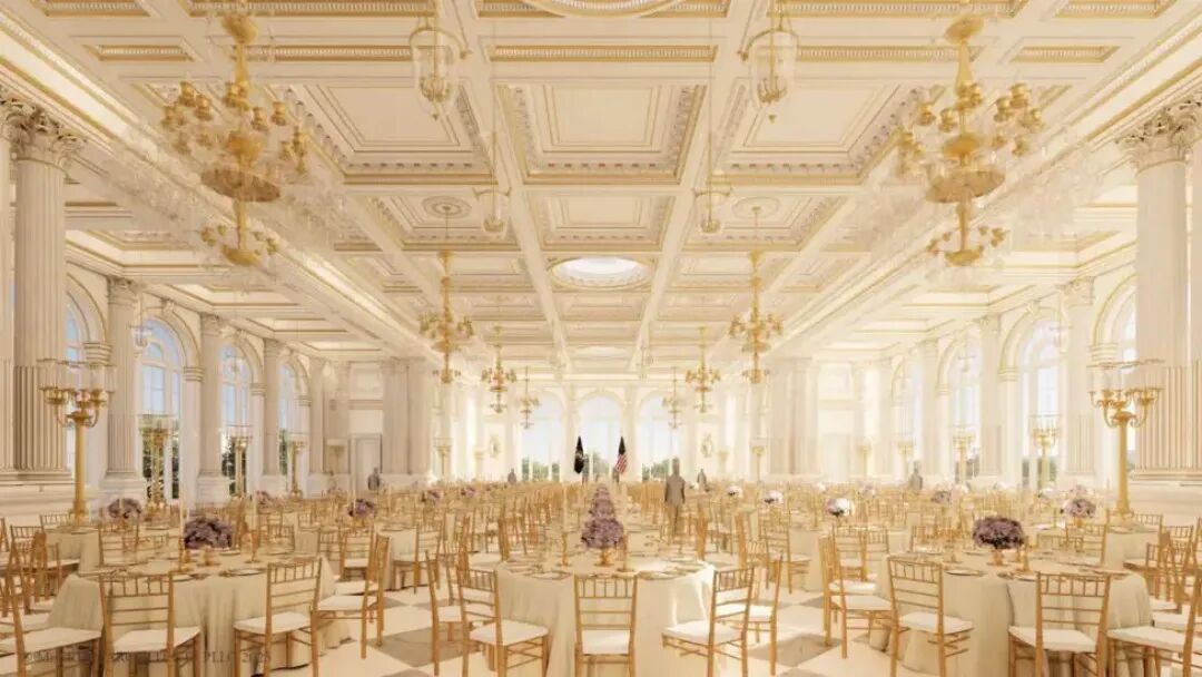 特朗普对白宫的装修、布置和格局不满已久。2025年3月,重返总统职位八周的特朗普就对椭圆形办公室(Oval Office)进行了一番改造。办公室墙上悬挂的画作数量增加了两倍,金饰无处不在:壁炉架上是镀金小雕像,桌子边上有一只镀金老鹰,门上有镀金的洛可可式镜子,门口上方的墙上还安放着从海湖庄园运来的金天使,甚至连走廊尽头的电视遥控器也镀上了金箔。但他不满足于此,很快宣布将改造白宫宴会厅。据特朗普在社交媒体上的介绍,宴会厅扩建后达8300多平方米,可容纳约1000名宾客。“我们很擅长建造,我很擅长建造。我们将准时完工。它会非常漂亮——堪称行业顶级。”特朗普当时表示。