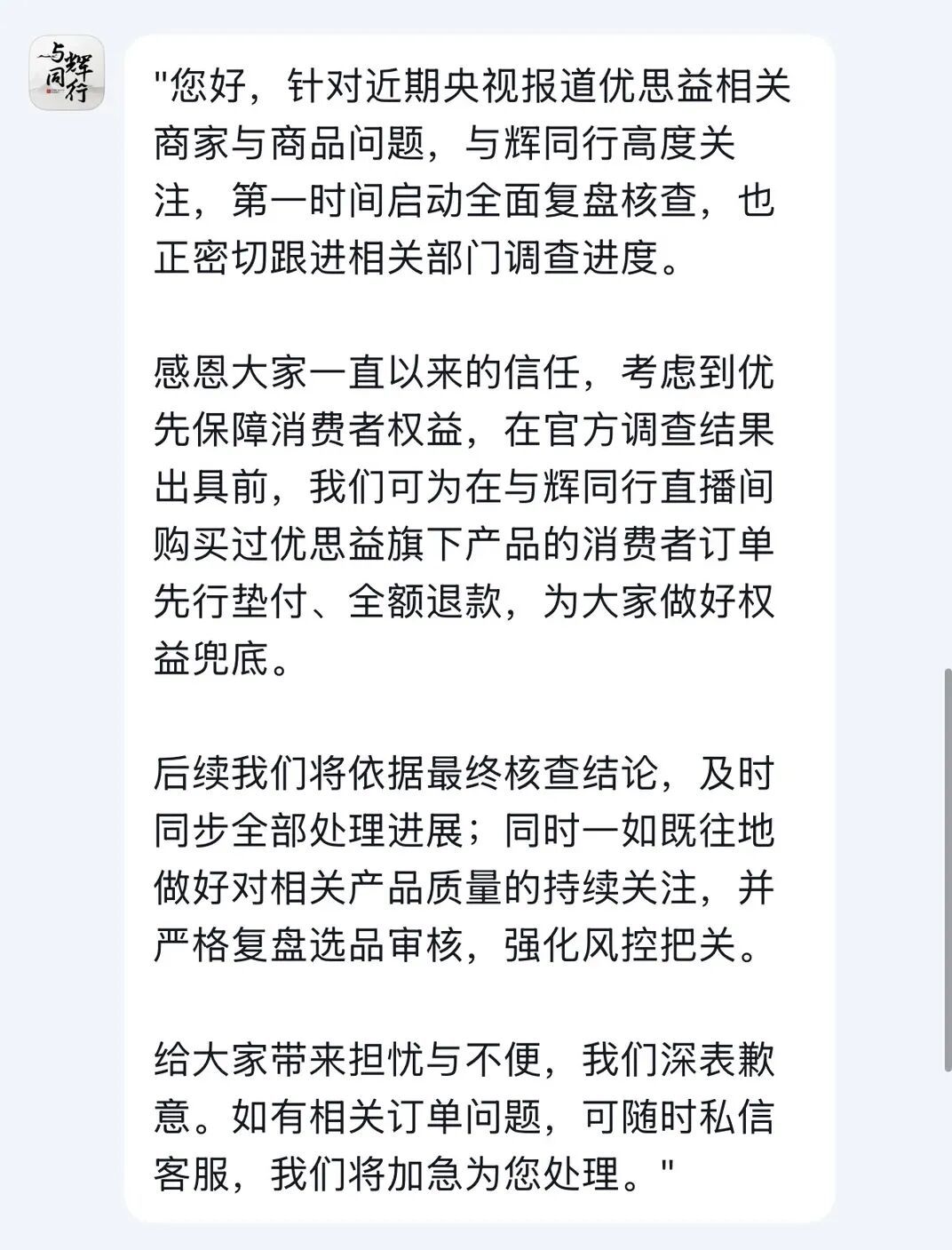 优思益“假洋牌”事件发酵后,包括章小蕙、李若彤、明道等在内的多位带货明星紧急道歉,承诺全额退款。4月2日晚间,作为直播带货销售额最高的渠道,一直沉默的与辉同行终于通过客服给出了解决方案:称会为在直播间下单的消费者全额退款,公司后续会严格复盘选品审核,强化风险把控。