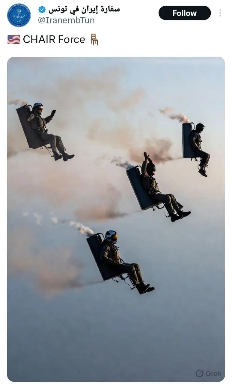 伊朗驻突尼斯大使馆账号,则发了一张美国飞行员纷纷弹射的照片,就两个词:椅子部队。