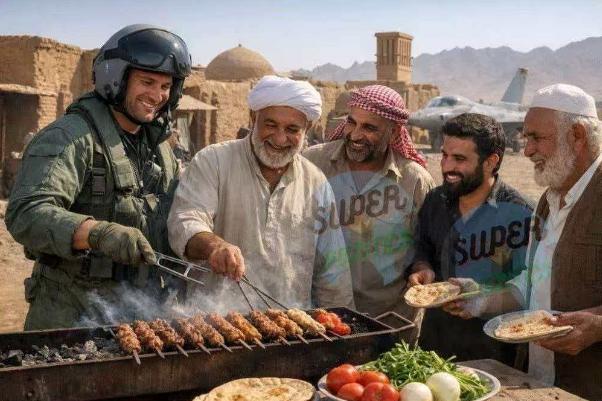 一看就是AI作品,也未必真是伊朗人做的。但旁边还英文提示:失踪的美国飞行员在社交媒体上披露,他没有失踪,只是和伊朗人一起烤羊肉串了……