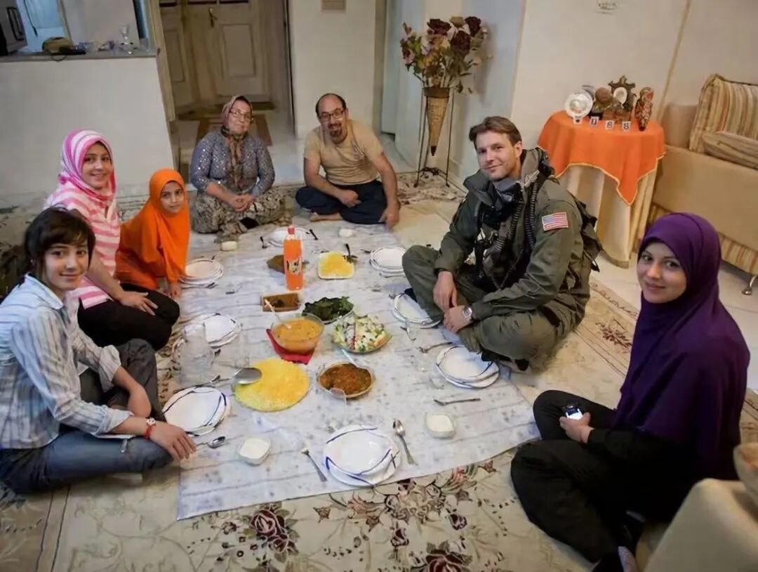 很多伊朗人贴出照片,“显示”美国飞行员在伊朗做客,和伊朗人共进晚餐,一起吃烤肉。