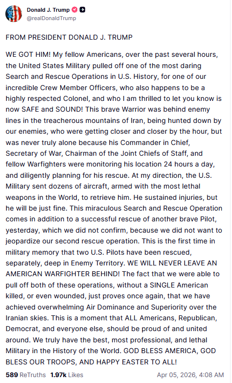 我们绝不会抛弃任何一名美国战士!我们能够成功完成这两次行动,而且没有一名美国人伤亡,这再次证明我们已经在伊朗领空取得了压倒性的空中优势。所有美国人,无论共和党人、民主党人还是其他任何身份,都应该为此感到自豪并团结一致。我们拥有世界历史上最优秀、最专业、最致命的军队。上帝保佑美国,上帝保佑我们的军队,祝大家复活节快乐!