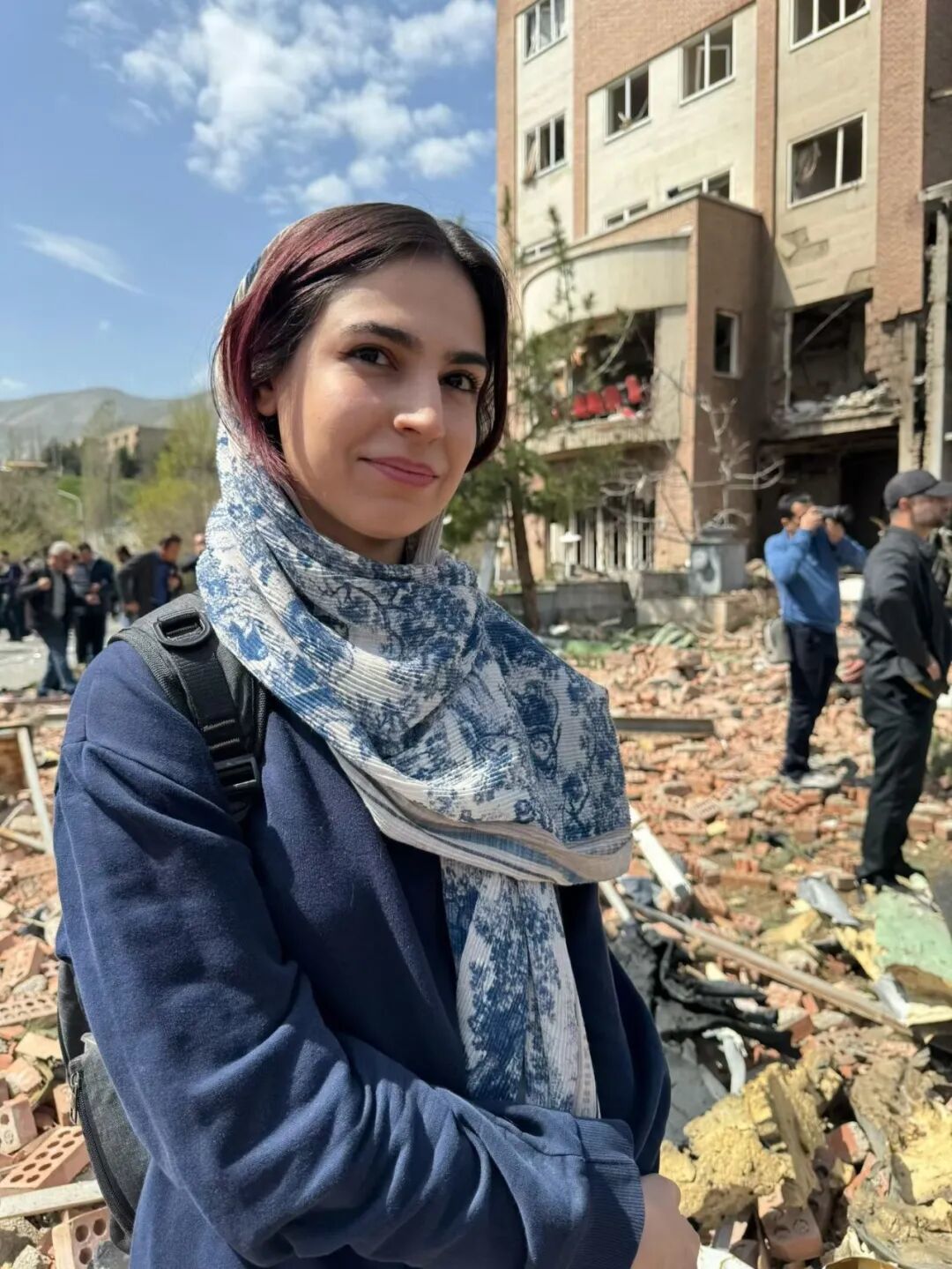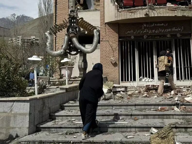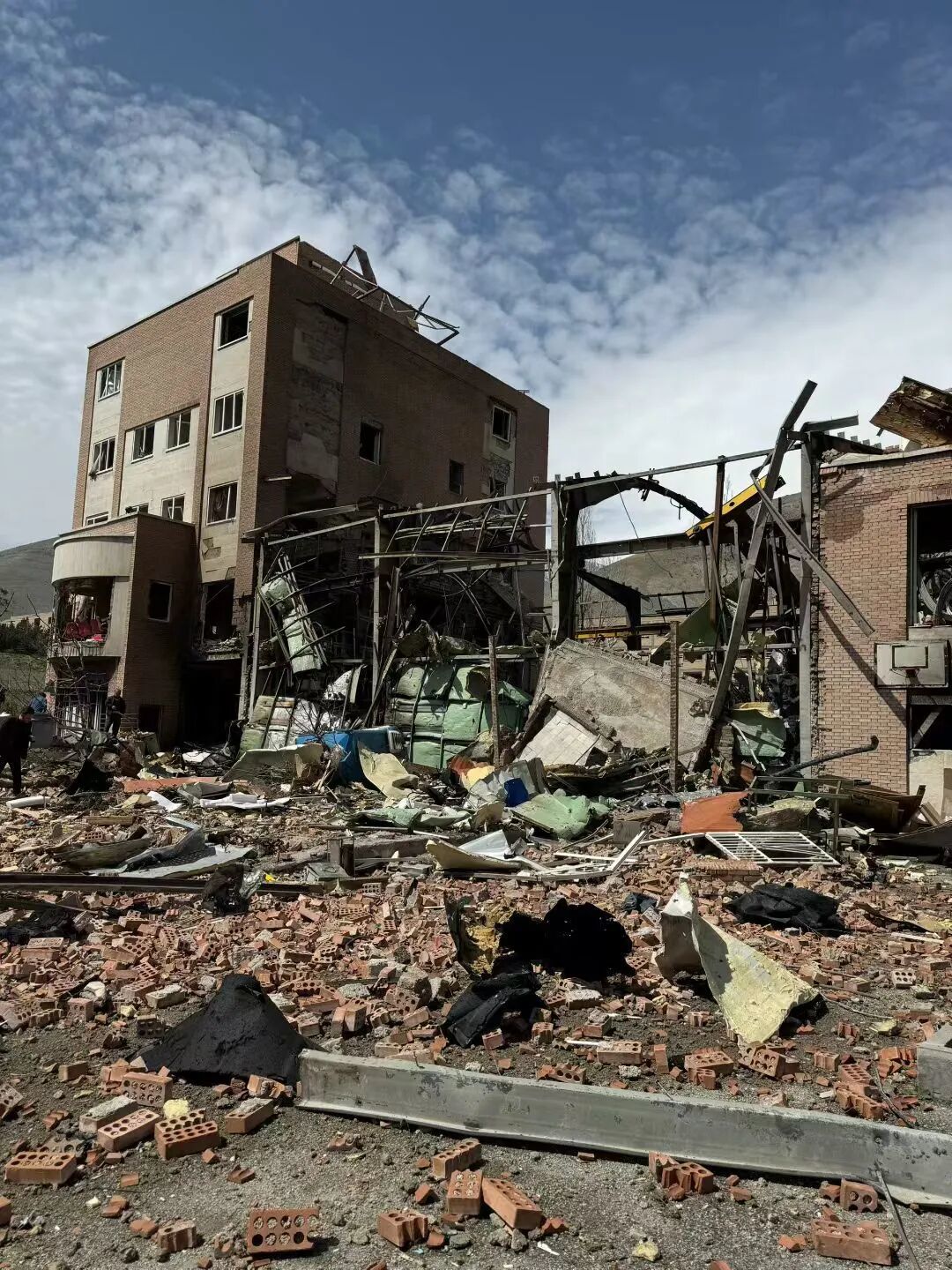 我们等到其他媒体都到了,就跟着安全人员的车一起进了学校。被炸的地方,在学校下面靠山的位置,是一栋四层楼的建筑,属于大学的激光与等离子体研究所。三号下午(昨天),我们在家感受到非常强烈震感的那一次,应该就是这里被导弹袭击了。现场看得出来,冲击波特别厉害,附近房子的玻璃几乎全都碎了,一片狼藉。那栋楼基本被打穿了。尤其是旁边那个本来很漂亮的实验室,听说花了很多心思建成的,现在已经被炸得几乎看不见原样。空气里还有一股特别冲的化学味道,很呛人。穆森说,昨天红新月会的人来时都得戴口罩,因为味道特别刺鼻。我们今天去的时候,那股味道虽然淡了一些,但还是能闻出来。