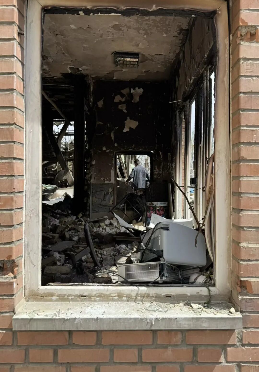 沿着墙体往里走,脚下全是碎砖、铁皮和各种建筑残骸,走路都很费劲。外墙被炸穿,因此从外面就能看到二楼的会议室,里面还有红色沙发;透过被炸的窗也看到桌上的显微镜,外院散落一地的书本和记录材料。真的觉得很可惜。再往远处看,这后面就是文学院和学生宿舍区。今天按理说应该是新年假期结束、正式开学上课的第一天,可校园里安静得不得了,一个学生都看不到。对面的宿舍楼也空空荡荡,窗帘散落着,窗框都掉了下来。学校的人说,从4号开始,已经全部改成线上上课了,没有学生留在宿舍。
