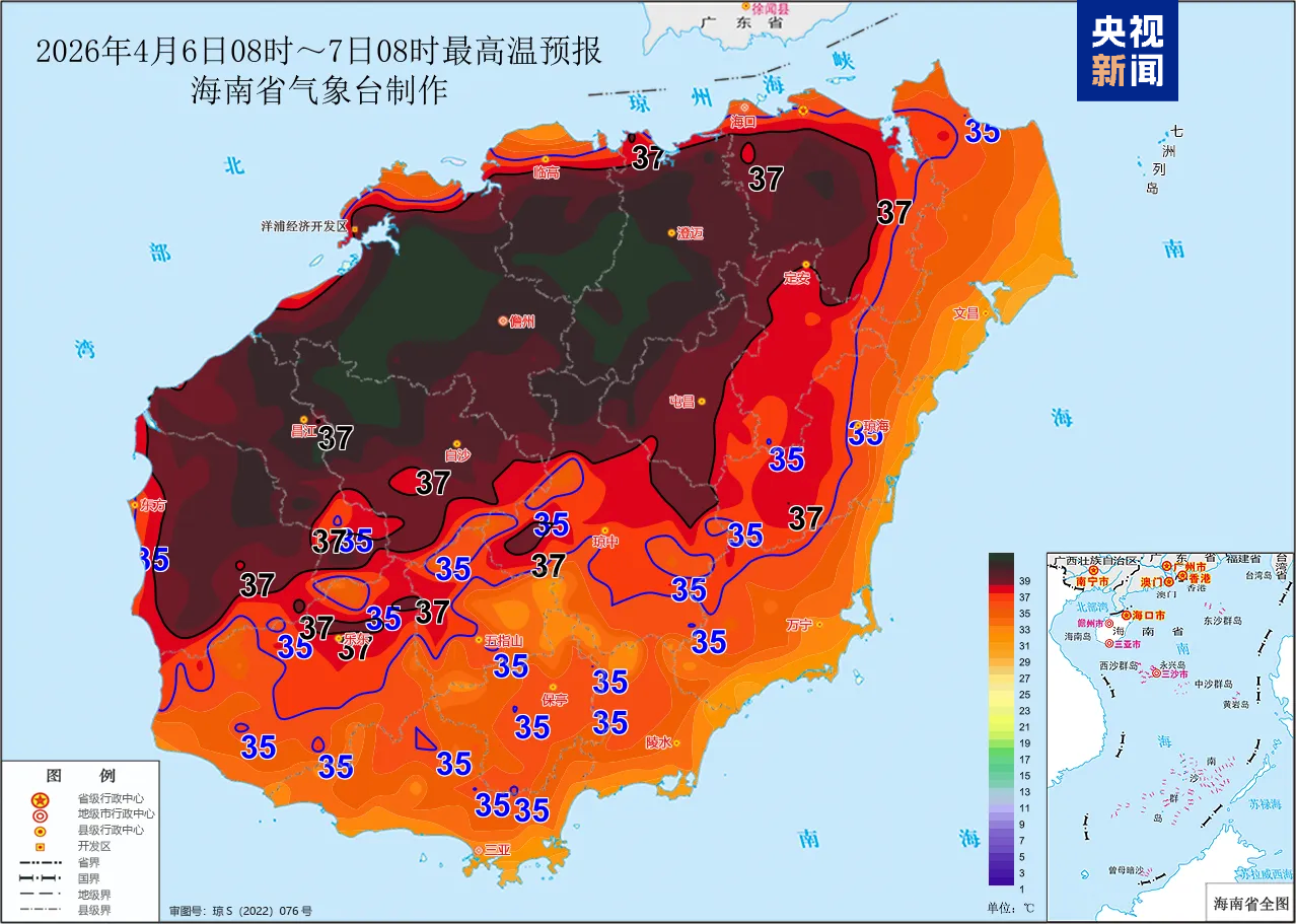 海南省气象局2026年4月6日10时00分继续发布高温四级预警:预计4月6日白天,海口、澄迈、临高、定安、屯昌、儋州、白沙、昌江和东方等9个市县的大部分乡镇将出现37℃以上的高温天气,请有关单位做好防暑降温、森林防灭火等相关工作。