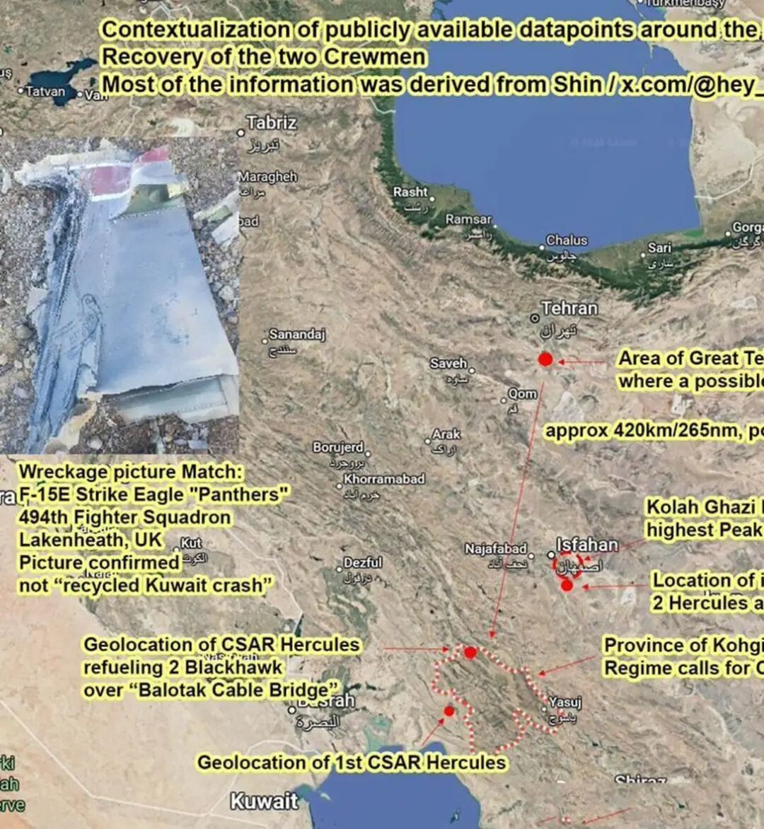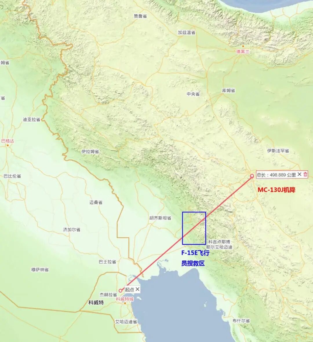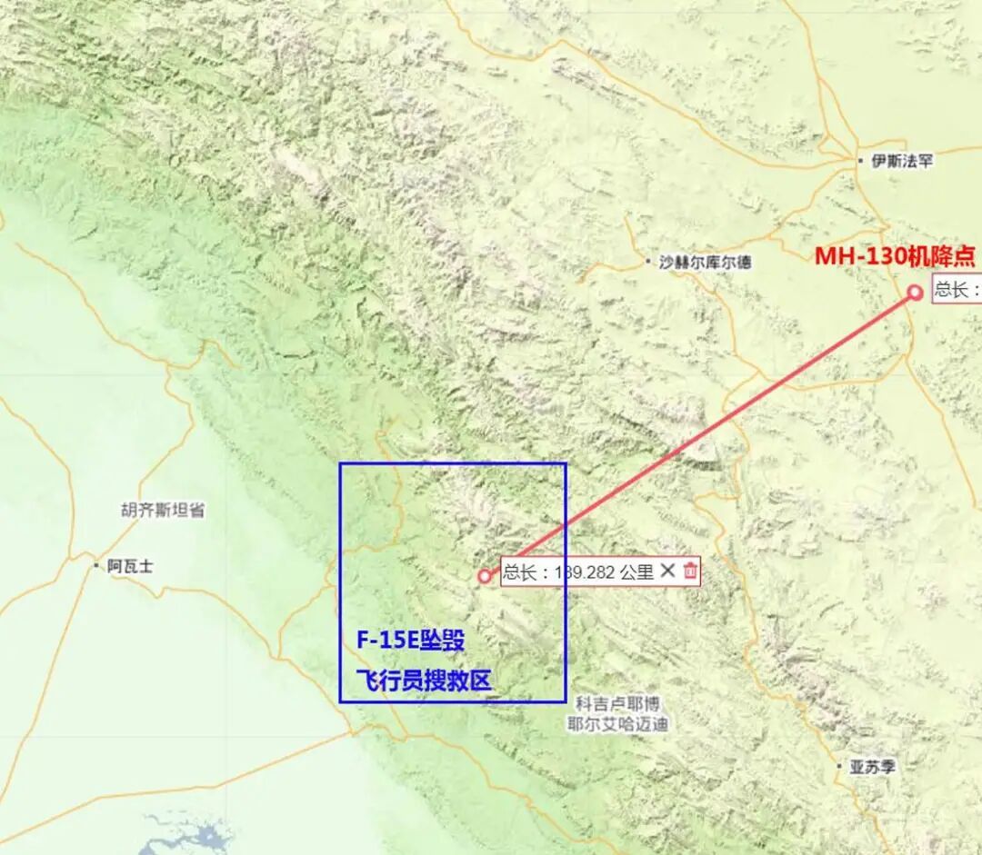 F-15E的残骸坠毁地点位于西南方向的胡齐斯坦平原,飞行员跳伞后落入科吉卢耶-博韦艾哈迈德省与恰哈尔马哈勒-巴赫蒂亚里省山区,美军空中力量与特种部队与当地伊朗武装部队民兵激烈交火。
