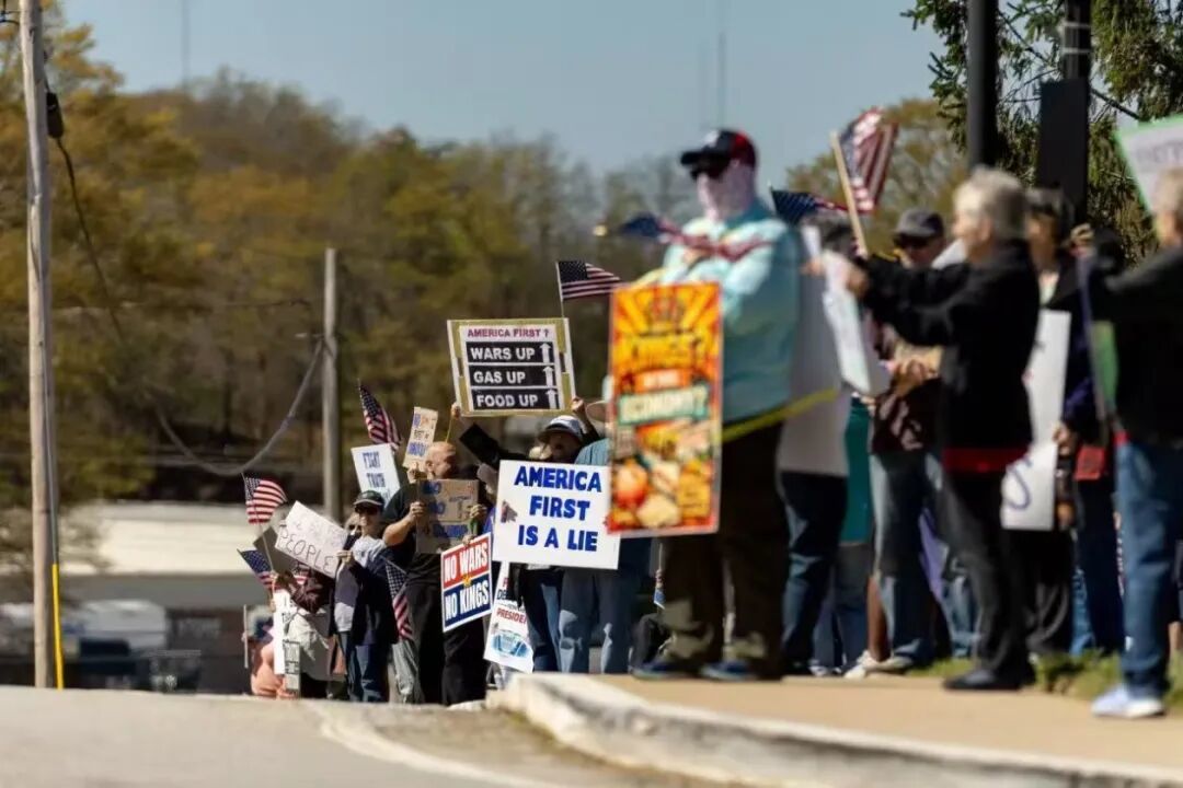3月28日,民众在佐治亚州举行反对特朗普抗议集会,抗议者举着写有“美国优先是谎言”“食品价格上涨、天然气价格上涨”等字样的标语牌。