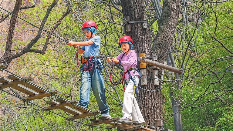 游客在嵖岈山“树顶攀跃”项目中挑战高空步道。