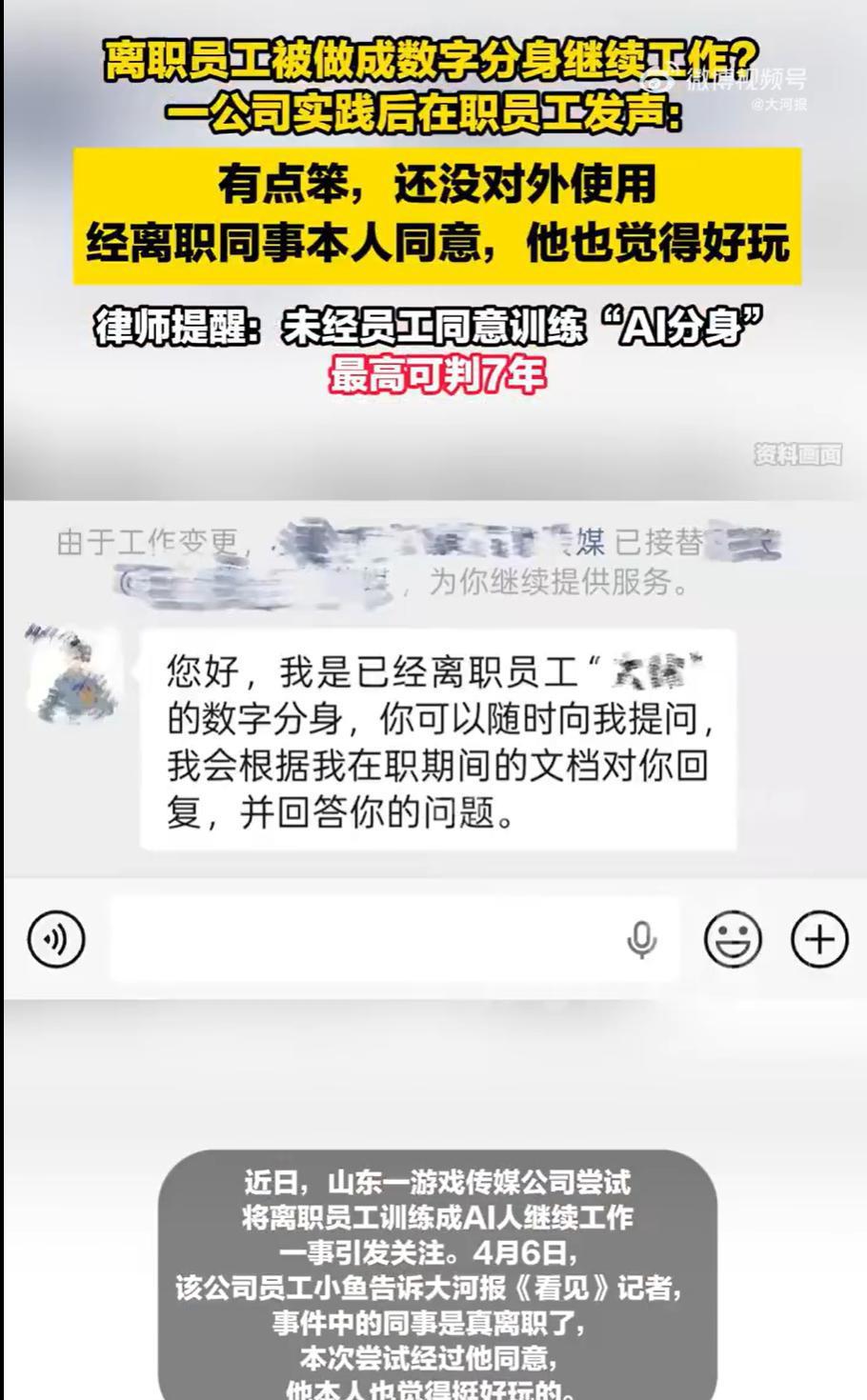 近日,山东一家游戏传媒公司尝试将离职员工训练成AI人继续工作一事引发关注。4月6日,该公司员工小鱼告诉记者,事件中的同事是真离职了,本次尝试经过他同意,他本人也觉得挺好玩的。小鱼称,该同事离职前是人事专员,其数字分身目前能做咨询、邀约、制作PPT和表格等简易工作。可以理解为打工人版豆包,但有点笨,只能应对一些简单指令。