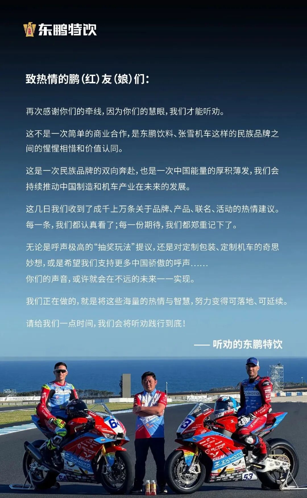 去年11月,张雪公开招募赞助商,却几乎无人问津。评论区里,网友纷纷点名东鹏特饮。东鹏特饮快速反应,两个月后正式签约,成为张雪机车唯一一家饮料赞助方。