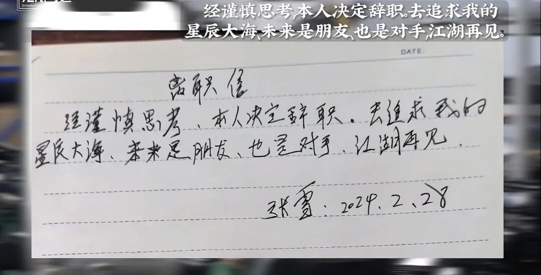 2024年3月,张雪在朋友圈官宣裸辞,“其实我还是很自私的,我只想着自己的梦想,没有照顾投资人的收益”。同时附上一封仅33个字的辞职信,最后写着“江湖再见”。