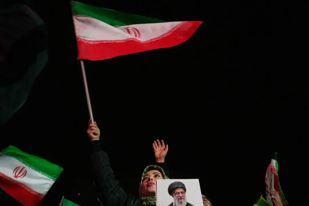 ◎ 当地时间2026年3月25日,伊朗德黑兰,一名女子在亲政府集会中挥舞伊朗国旗并手持已故伊朗最高领袖哈梅内伊的画像